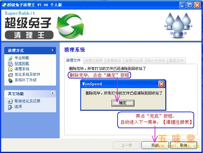超级兔子清理王只清除已被勾选的文件。选好后,点击右下方的“清除”按钮,就能开始清除垃圾文件了: