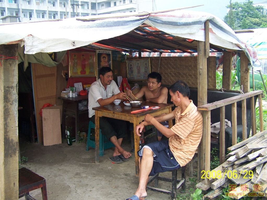 接下來是找災民的集中居處,走出主街道,看到好多帳篷,先去一小學安置點,打聽説那裏並無需要我們幫助的對象,建議我可以到武都鄉鎮看看。後問一位還在吃飯的石姓災民並説明來意。他告知,現在在家的傷員不多,要