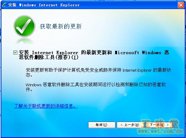 % B1 k3 B, E( Y$ g3 H 不要忘了,我们已经在第四步断开了网络哦。所以,把这里“安装 Internet Explorer 的最新更新和……”前面复选框里的小勾去掉!再点下一步。