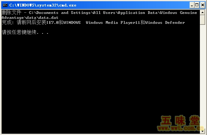 / x l: I; ~. b: L# t4 v7 r 第四步,断开网络连接,点击运行《免验证安装.bat》程序,出现黑色文本框提示“请按任意键继续”时,可以按任意数子/字母或回车键,程序自动运行结束(这是免验证程序,所谓的“破解补丁”,必须执行——除非自己懂得删除 C:\Documents and Settings\All Users\Application Data\Windows Genuine Advantage\data 里面的 《data.dat》文件)。 ) k' E3 q/ V# t8 k6 T, \- x, V